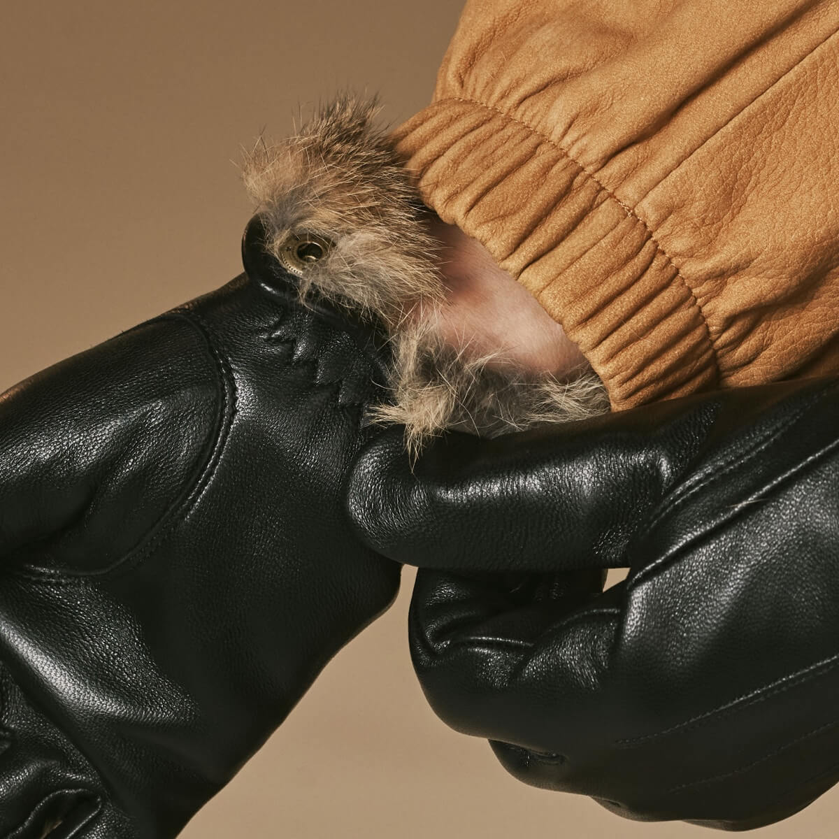 Konijnenbont voering: De rijke bruine konijnenbont voering biedt uitzonderlijke warmte en comfort, zelfs tijdens de koudste winterdagen.